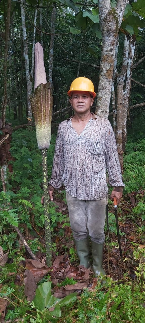 Bekaespedia.com, Simpang Rimba,- Bangka Selatan – Tiga petani Desa Gudang, Kecamatan Simpang Rimba, Kabupaten Bangka Selatan, menemukan bunga bangkai atau Amorphophallus titanum di dalam hutan Binjai Manis desa Gudang, pada hari senin (18/8/2025)