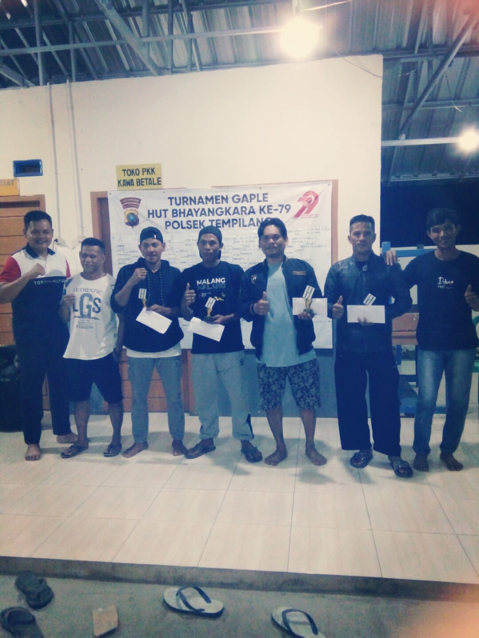 Kapolsek Tempilang Ipda. M. Deni Kurniawan, SH. seizin Kapolres Bangka Barat AKBP. Pradana Aditya,Nugraha, SH. S.I.K dalam sambutannya mengatakan mengapresiasi atas pelaksanaan Turnamen gaple HUT Bhayangkara ke 79 Polsek Tempilang yang di ikuti 71 peserta, baik antusiasme peserta maupun loyalitas dari Panitia Pelaksana. Kami atas nama Polsek Tempilang mengucapkan selamat kepada para pemenang, jika ada kesempatan dilain waktu mudah-mudahan kita dapat melaksanakan kembali turnamen gaple dalam even yang berbeda, kata Deni.