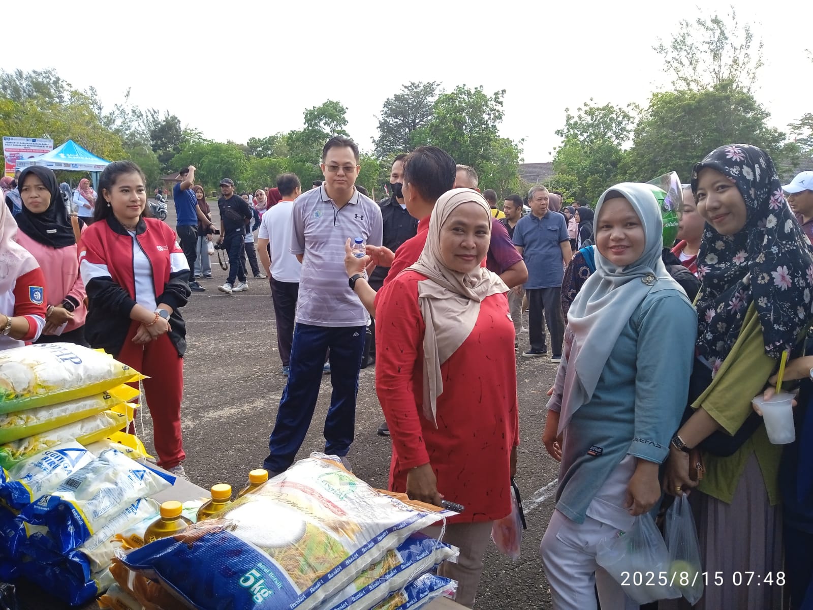 Suara riuh transaksi berpadu dengan deru printer dari stan pelayanan pajak, ketikan keyboard, dan aroma seduhan kopi serta kue panas. Tak jauh dari sana, stan kesehatan gratis dari Jasa Raharja ramai didatangi warga yang memeriksa tekanan darah dan gula darah. Di ujung lapangan, pasar murah pangan yang digelar Bulog dan Dinas Pertanian menjadi magnet tersendiri—beras, gula, minyak goreng, dan telur berpindah tangan dengan harga terjangkau, sebagian bahkan dibayar lewat QRIS.