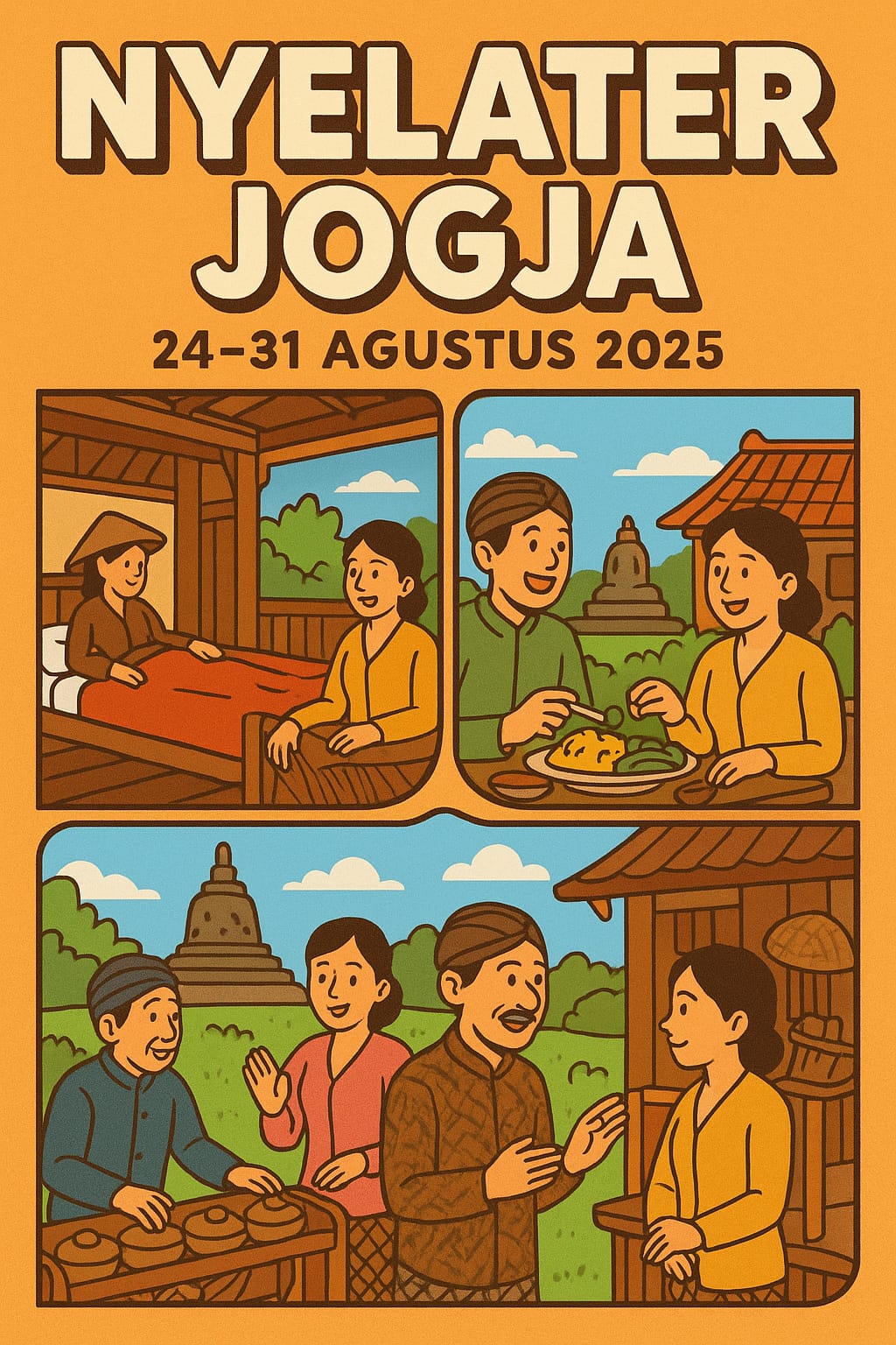 Yogyakarta_bekaespedia.com. Ada lima orang Mapor di Jogja dari tanggal 24 sampai dengan 31 Agustus 2025. Bukan untuk sekolah atau kuliah, tetapi belajar langsung cara mengembangkan pariwisata berbasis budaya. Nyelater Jogja dipilih menjadi judul kegiatan ini untuk mempresentasikan semangat belajar budaya di tanah Jawa tanpa melupakan identitas sebagai orang Mapor. Nyelater berasal dari bahasa Melayu Mapor berarti berkunjung dan bersilaturahmi. Dalam bahasa Melayu Bangka disebut Natak atau Ngayau. Atau dolan versi orang Jawa.