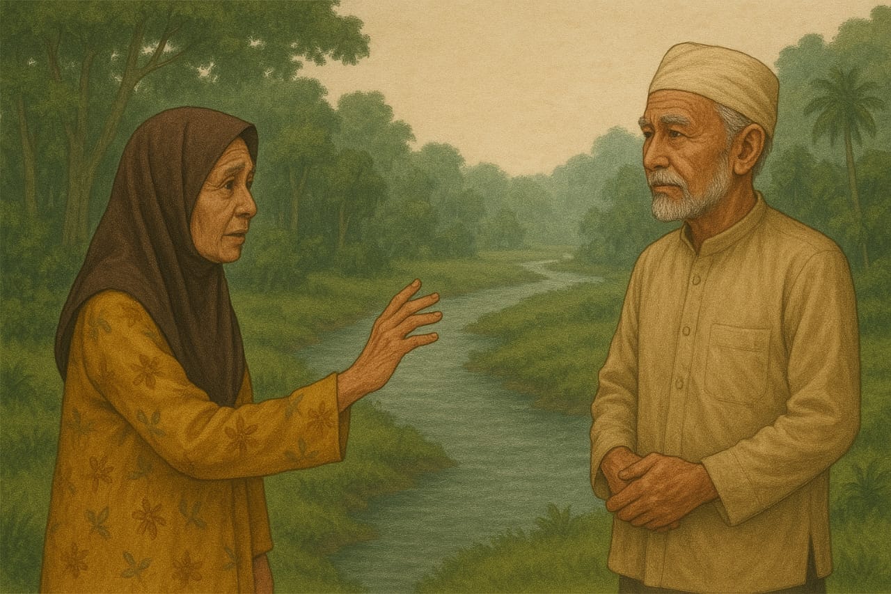 Buk Rud, yang sedang membereskan bakul rotannya, tertarik pada bayangan kesedihan itu. Langkahnya yang berat diayunkan pelan mendekati sang pemuda. Suara bakulnya berderit-derit lembut, bagaikan ratap bumi di kala sore.