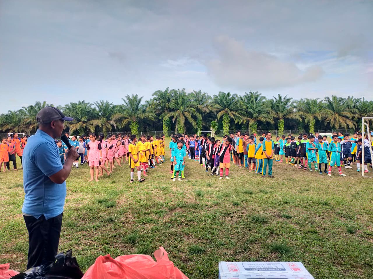 Pertandingan ini memperlihatkan barisan tim putri, sebagian mengenakan seragam biru-merah, sebagian lagi serba hitam dan kuning. Mereka berdiri sejajar di bawah langit cerah, dengan latar belakang kebun sawit yang seolah menjadi penonton setia. Di wajah-wajah muda itu terpancar semangat ada rasa bangga, gugup, dan harapan yang sama menjadi juara bukan hanya di lapangan, tapi juga di kehidupan.